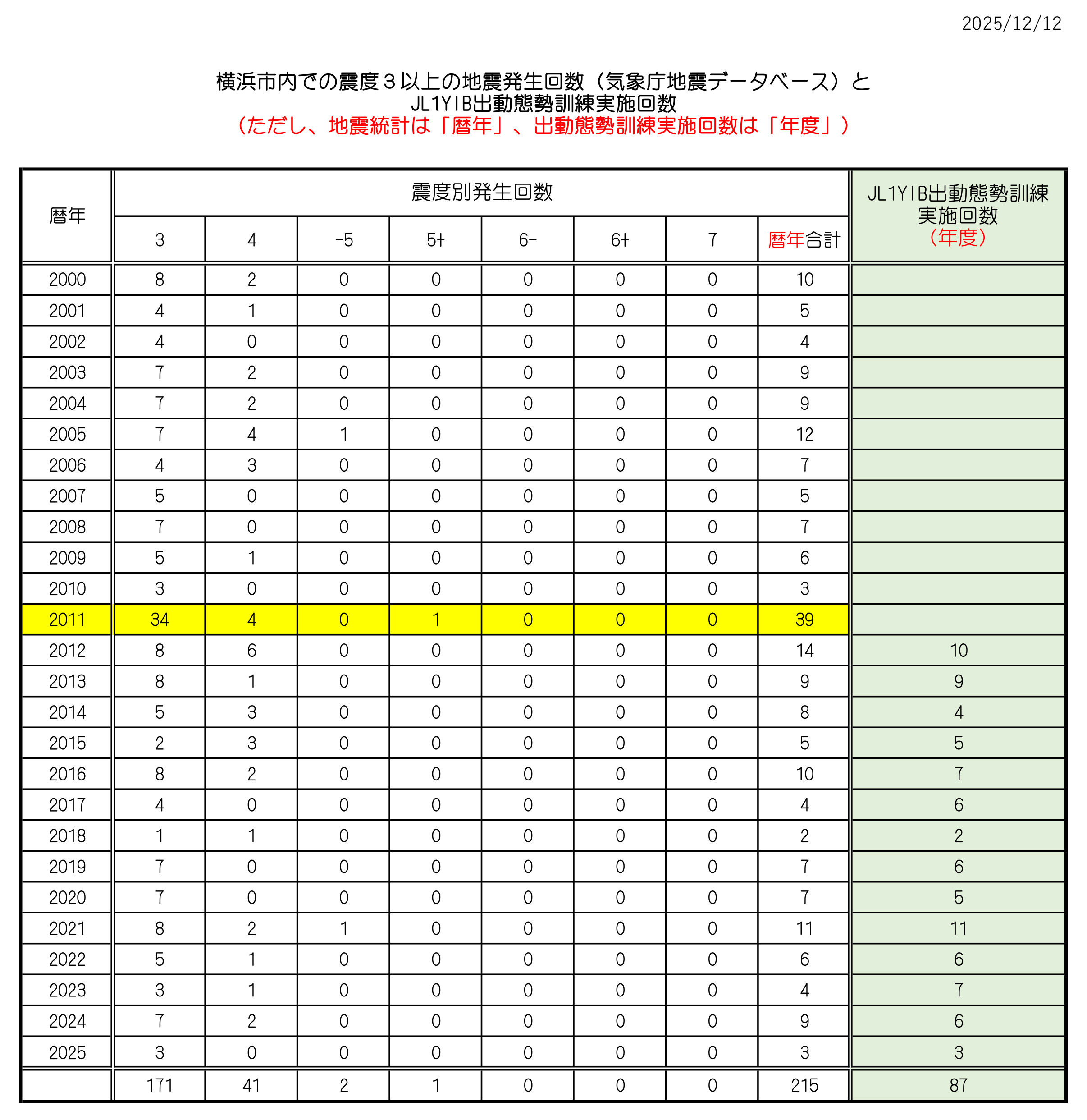 支部会員のJK1JASが、2000年以降に横浜市内で最大震度が3以上を記録した地震の発生回数と、2012年に開始した当支部の出動態勢訓練の回数をまとめてくれました。(2025年12月12日現在)