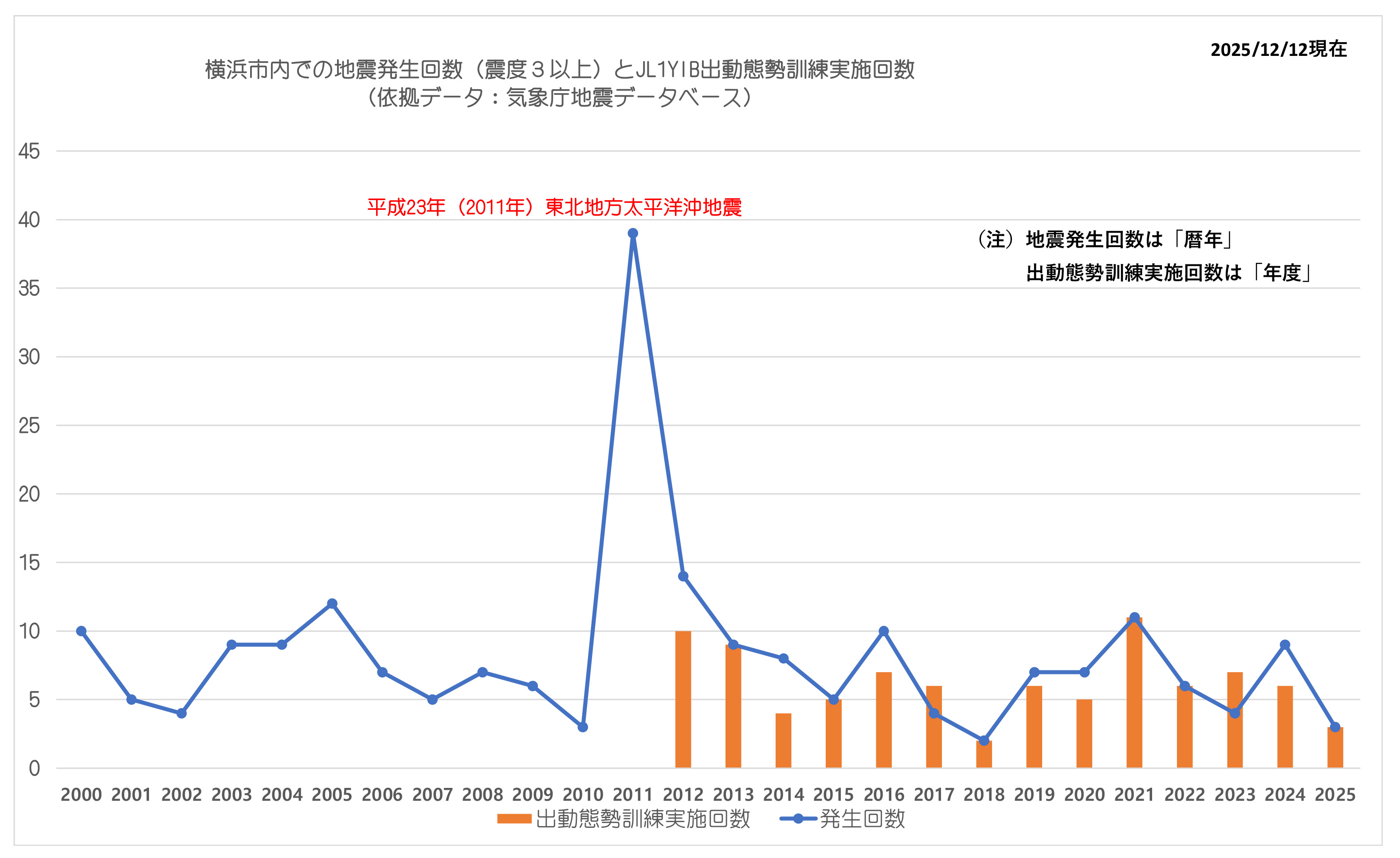 支部会員のJK1JASが、2000年以降に横浜市内で最大震度が3以上を記録した地震の発生回数と、2012年に開始した当支部の出動態勢訓練の回数をまとめてくれました。(2025年12月12日現在)