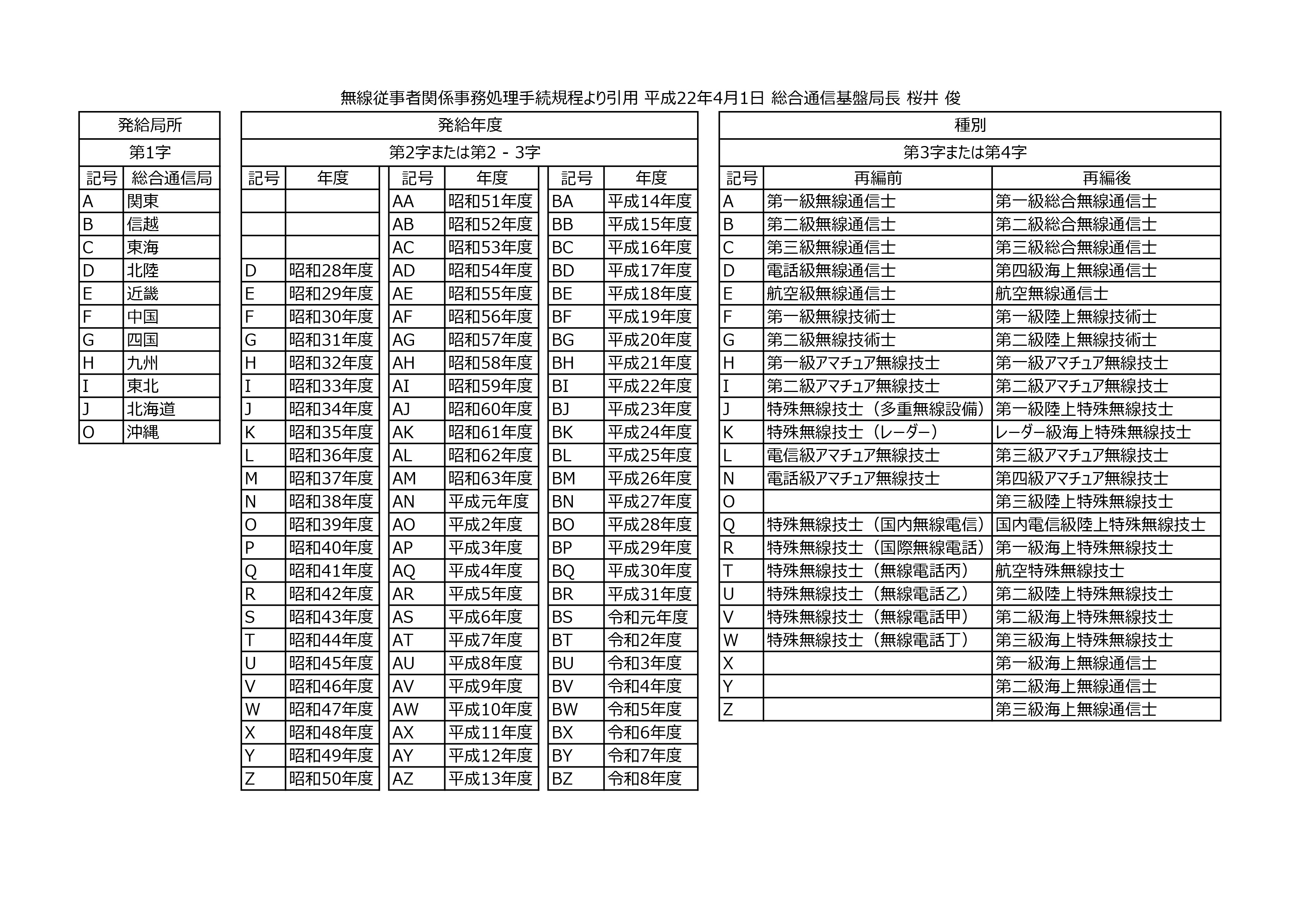 プリフィックスに続き、無線従事者免許証番号の記号部分についても発給局所、発給年度、資格種別を一覧表にまとめてみました。