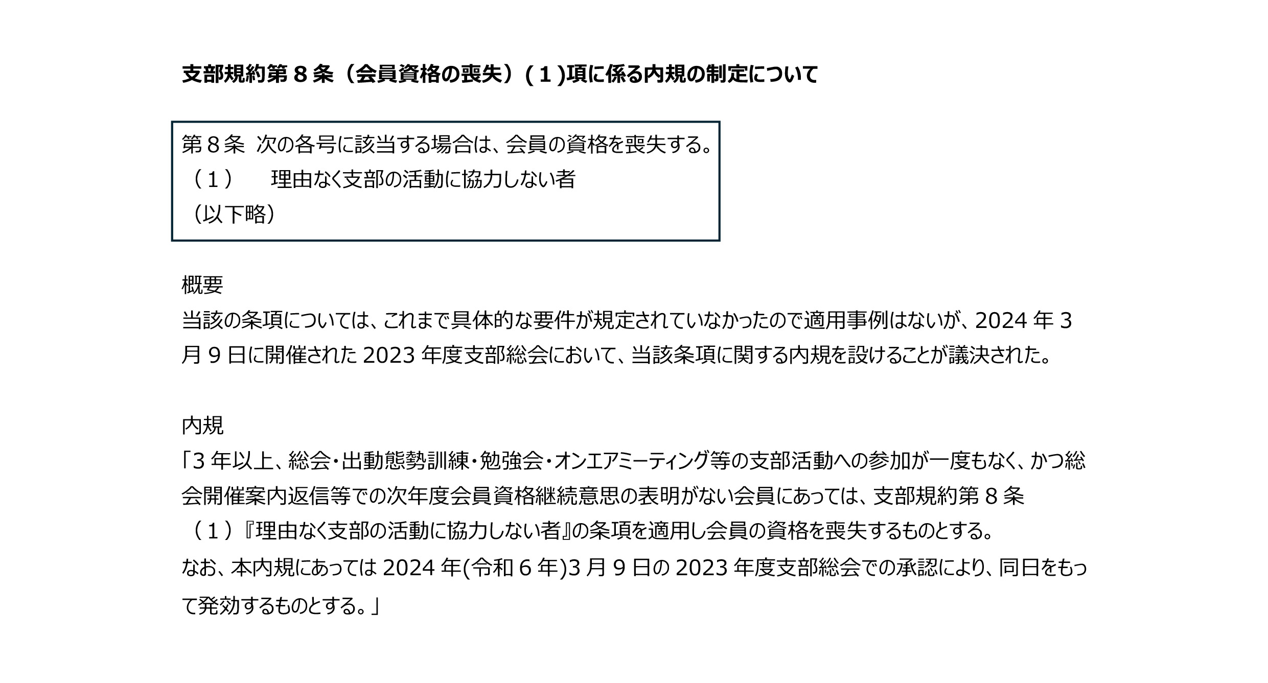 2024年3月9日の支部年度総会で支部規約第8条(会員資格の喪失)に関する内規を設けることが議決されました。